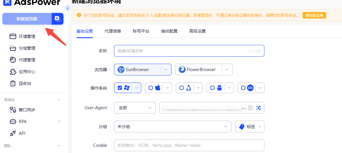 2、点击“新建浏览器”按钮以创建新指纹配置