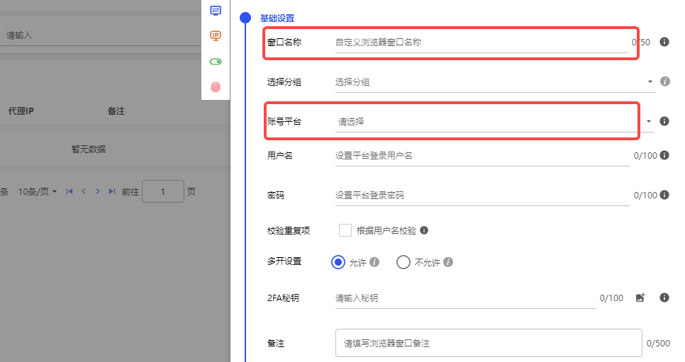 3、从列表中选择账号平台,并填写其他信息所需的内容。