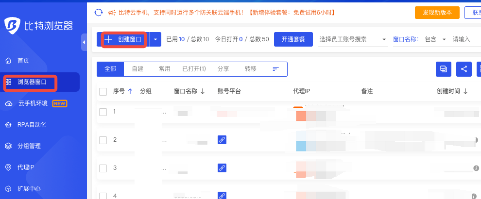2、进入后台的“浏览器窗口”侧边栏标签页,并点击“创建窗口”。