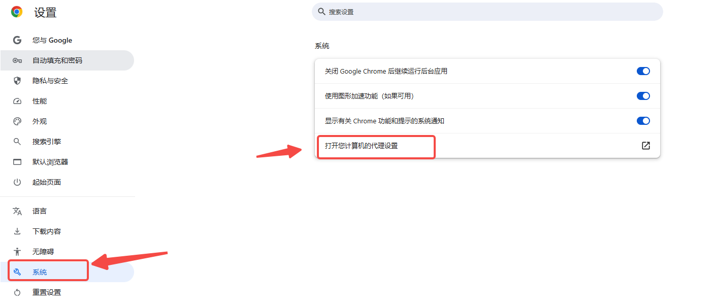 添加代理设置路径:设置 > 系统 > 打开您的计算机代理设置 > 操作系统设置