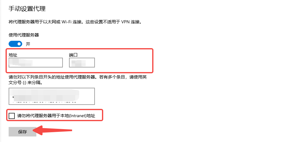3、点击“打开您的计算机代理设置”。选择之前提取的 IP 地址,输入 IP 和端口,然后点击“保存”。