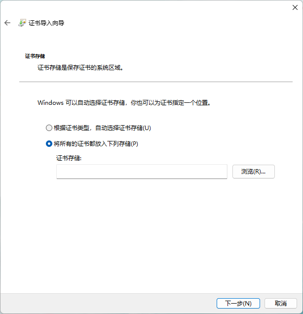 4、选择“将所有的证书都放入下列存储”,然后点击“浏览”按钮