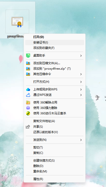 2、鼠标右键点击证书,在菜单中选择“安装证书”,打开证书导入向导