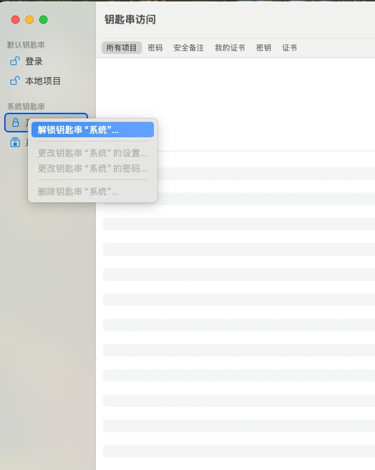 3、右键点击系统,选择“解锁钥匙串“系统””,再次输入开机密码