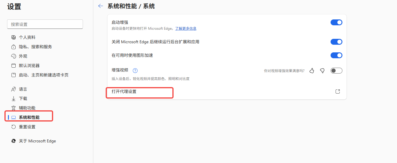 第 1 步 配置代理 第 2 步 打开 Microsoft Edge 浏览器 1、打开 Microsoft Edge,点击右上角的图标,进入“设置”。 2、选择“系统和性能”,点击“打开您的计算机代理设置”。 3、点击开启代理服务器,输入 IP 地址和端口,然后点击“保存”。 4、打开一个新窗口检测 IP 地址,显示的就是所分配的代理。