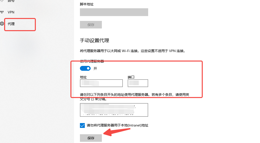 3、点击开启代理服务器,输入 IP 地址和端口,然后点击“保存”
