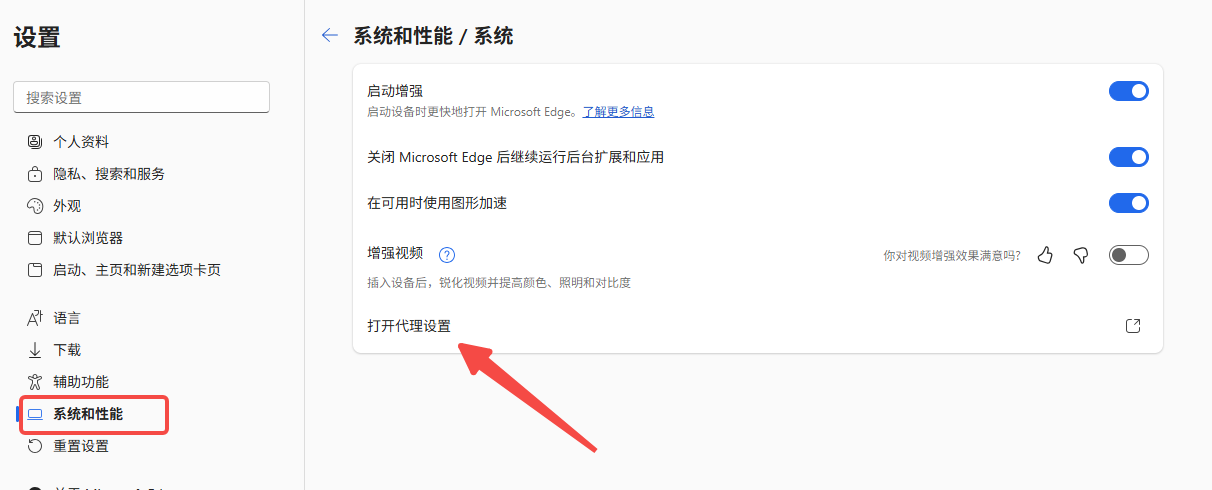 2、选择“系统和性能”,点击“打开您的计算机代理设置”
