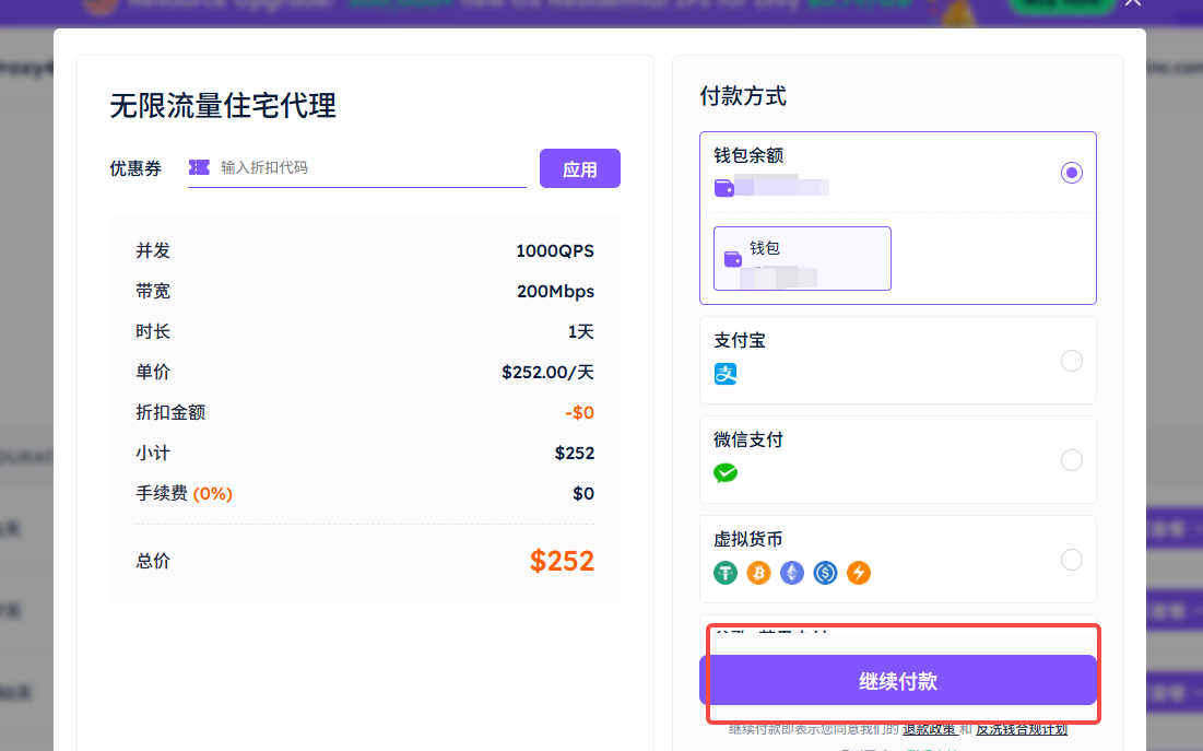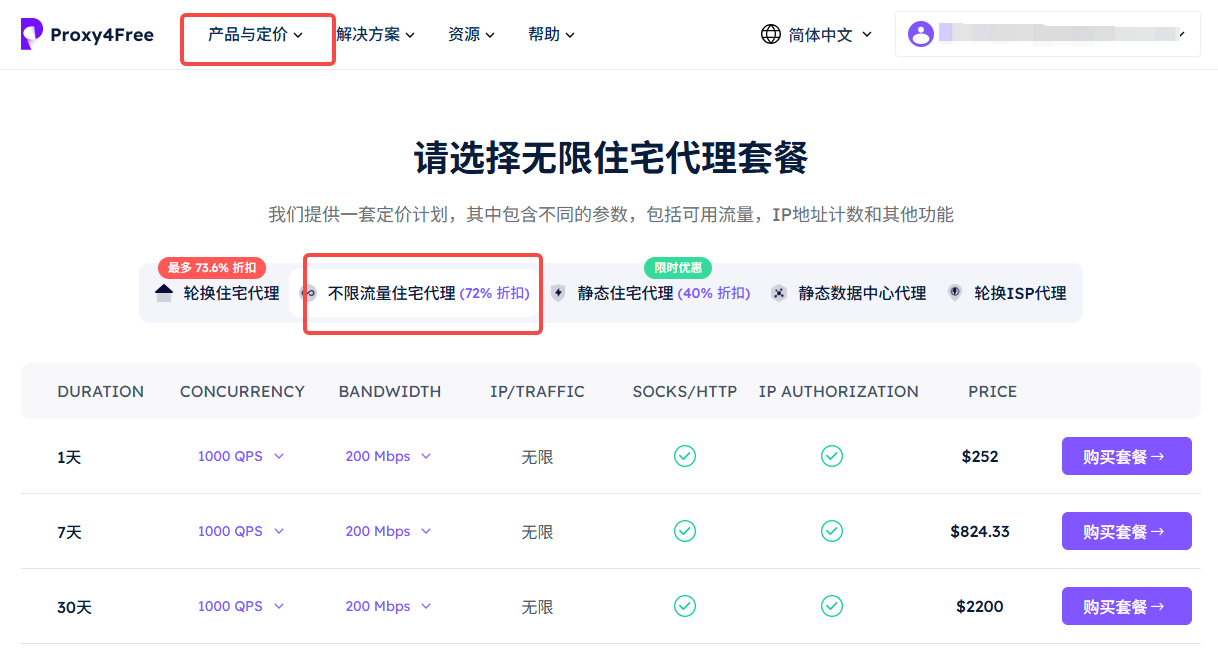 1、在定价页面选择合适的“无限住宅代理”产品。