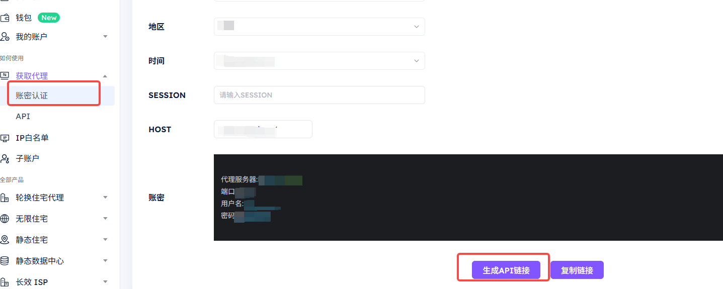 4、点击“用户名和密码认证”以选择一个无限住宅代理。选择协议、格式、时长和分隔符,然后点击“生成”。
